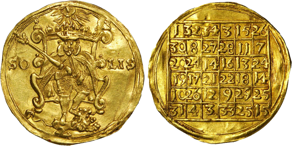 Na parte posterior havia algo conhecido na numerologia como o “quadrado mágico do Sol”, que tinha seis casas na horizontal e seis na vertical, cada uma contendo um número. Ao somar os valores das seis casas, chega-se ao número 666.