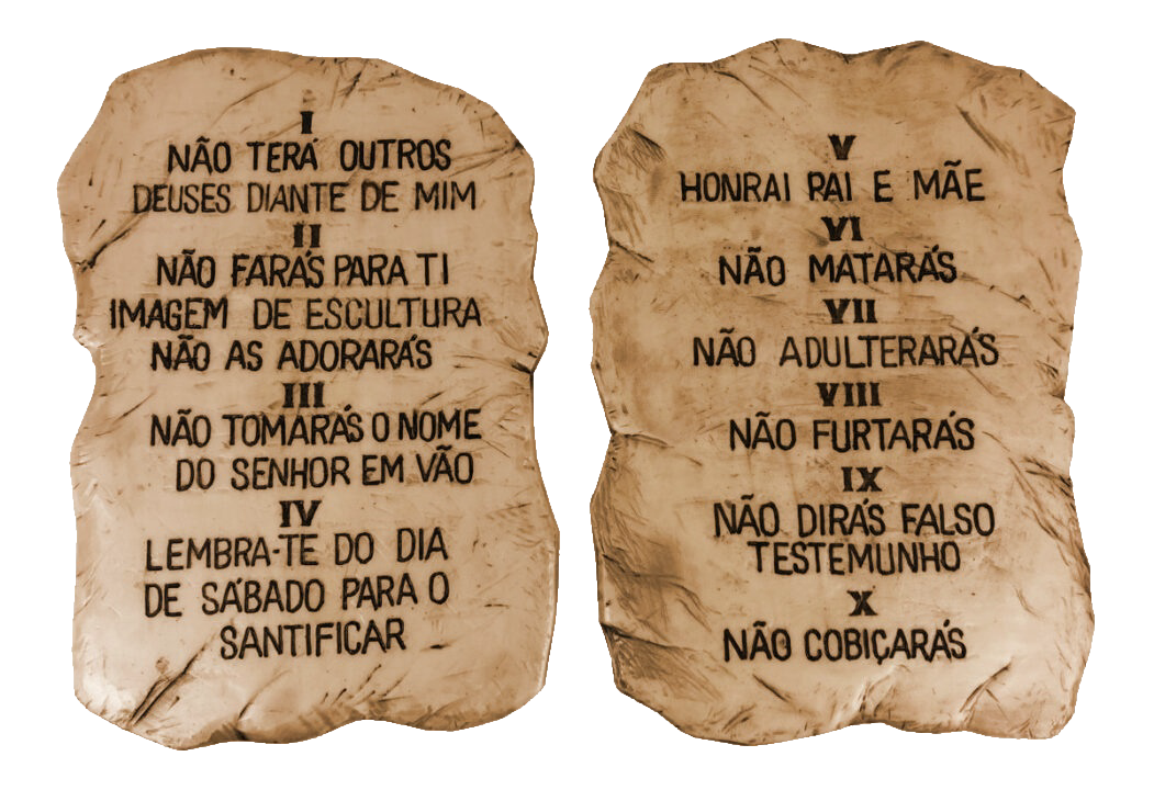 Deus deu a Moisés duas tábuas de pedra escritas com Seu próprio dedo. A primeira tábua inclui quatro mandamentos; esses quatro primeiros, como os encontramos na Bíblia, estão relacionados a Deus: