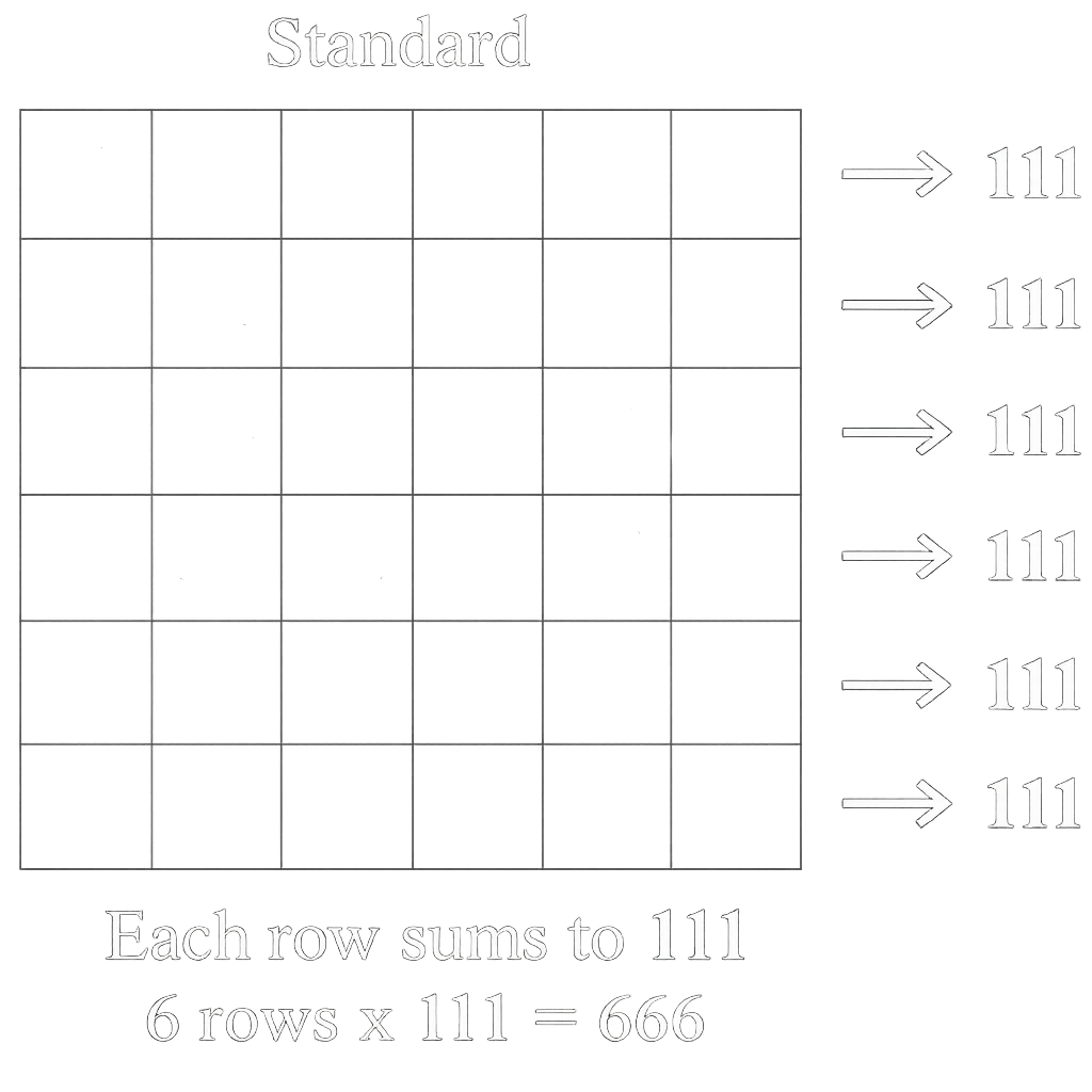 Se você somar os números verticalmente ou horizontalmente, o resultado será sempre 111 por linha. E, ao somar os totais de cada linha, chega-se ao número 666.