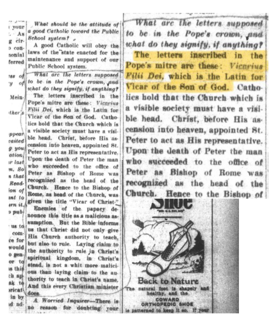“Que significam as palavras na coroa do Papa, e o que elas simbolizam, se é que têm algum significado? As palavras escritas na coroa do Papa são: Vicarius Filii Dei, que em latim significa ‘Vigário do Filho de Deus’. Os católicos mantêm sua posição de que a Igreja deve ter um cabeça visível. Cristo, antes de subir ao céu, nomeou São Pedro para agir como Seu representante.”