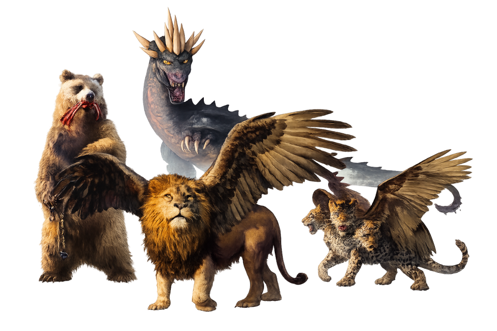 O primeiro era como leão e tinha asas de águia… E eis aqui outro animal, o segundo, semelhante a um urso; o qual se levantou de um lado, tendo na boca três costelas entre os dentes… Depois disto eu continuei olhando, e eis aqui outro, semelhante a um leopardo, que tinha nas costas quatro asas de ave; tinha também este animal quatro cabeças, e foi-lhe dado domínio.” — Daniel 7:4–6