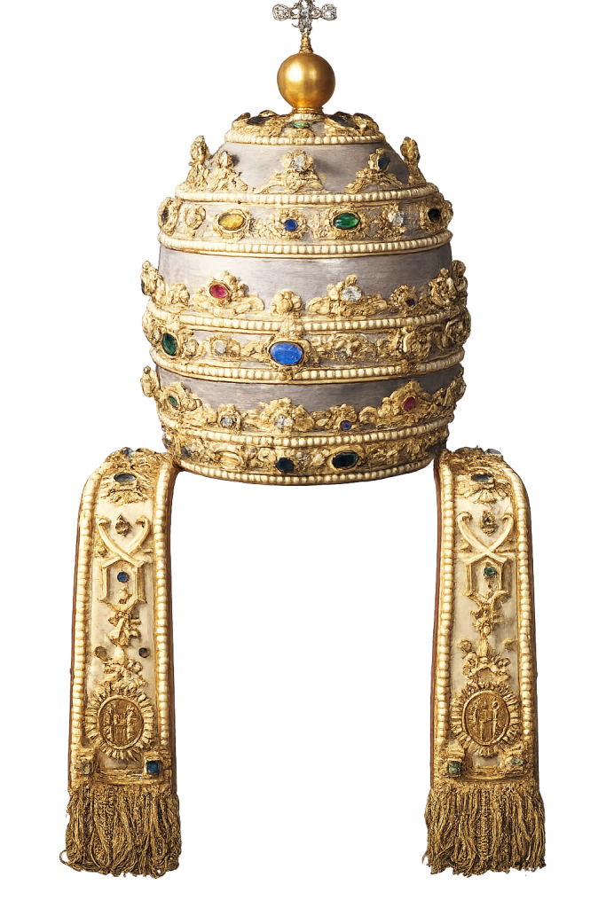 Os papas também utilizaram algo chamado “tiara papal”, que consiste em três coroas. Permitamos que eles mesmos expliquem o significado do seu simbolismo: