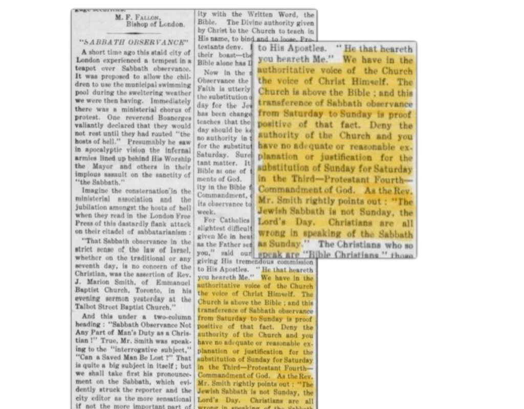 “Temos na Igreja a própria voz autorizada de Cristo. A Igreja está acima da Bíblia; e essa mudança do sábado para o domingo é prova desse fato. Se a autoridade da Igreja fosse rejeitada, não haveria explicação nem justificativa para a substituição do sábado pelo domingo no terceiro — protestante — quarto mandamento de Deus.”